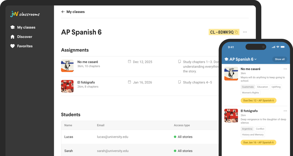 Students study the stories at home, and arrive at class ready for discussion and activities.